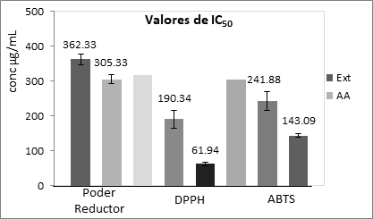 El poder reductor se determinó según experiencias previas del grupo de investigación.8 Brevemente: a 2,5 mL de los extractos a evaluar se le añadió 2,5 mL de ferricianuro de potasio (10 g/mL), incubándose por 20 minutos a 50 °C. Una vez frescas las muestras, se añadieron 2,5 mL de ácido tricloroacético (100 g/mL) para luego centrifugar (2 000 rpm) por 10 minutos. Posteriormente, se tomaron 5 mL del sobrenadante al cual se le añadieron 5mL de agua destilada y 1 mL de FeCl3 (1 g/L). Se midió en espectrofotómetro la absorbencia a 700 nm contra un blanco preparado con agua destilada. El poder reductor se expresó como la concentración del extracto al cual se alcanza el 50 % de la absorbencia máxima (IC50). Se empleó ácido ascórbico como control positivo.