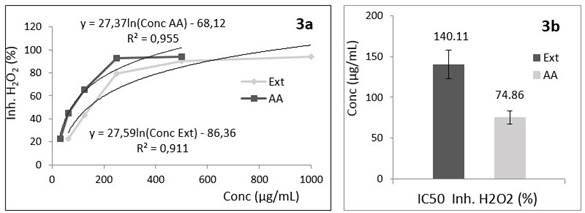 Los resultados obtenidos en este ensayo se muestran en la Figura 3. Nuevamente el extracto de S. mombim en etanol al 70 % clasificó como menos activo que el ácido ascórbico empleado como sustancia antioxidante de referencia (p=0,002). En este caso específico, no se logró una ecuación de una recta que describa con calidad estadística el fenómeno de captación del radical ni para el extracto ni para el ácido ascórbico. En consecuencia, una regresión logarítmica fue realizada (Figura 3a), calculando a partir de ella los valores de IC50 estimados en 140,11 y 74,86 µg/mL para el extracto y el ácido ascórbico respectivamente.