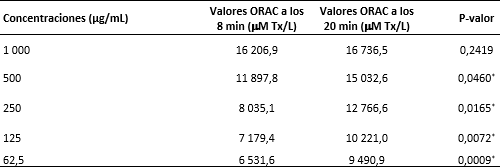 Como se puede apreciar en la tabla, para ambos tiempos de medición existió una relación directamente proporcional entre la neutralización de los radicales de oxígeno y la concentración de los extractos, por lo que se puede afirmar que es un proceso concentración dependiente, tal y como ocurre en cinco test antioxidantes anteriormente presentados. De igual manera, y a juzgar por el p-valor calculado, se demuestra que a concentraciones cercanas a los 1 000 µg/mL del extracto de hojas de S. mombim se logró el máximo de neutralización para este extracto, pues los valores de ORAC obtenidos a esta concentración no difirieron estadísticamente entre sí. Sin embargo, a concentraciones inferiores se observaron diferencias significativas entre los tiempos de medición (las que son más marcadas a medida que la concentración disminuye), indicando que el proceso de neutralización de los radicales de oxígeno por el extracto de hojas de S. mombim ocurrió rápidamente a concentraciones elevadas, pero a medida que la concertación disminuyó, este proceso se enlenteció requiriendo de tiempos superiores a los 20 minutos para alcanzar el equilibrio Redox del sistema.