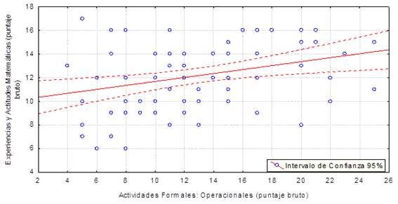 Además, se encontró una relación media positiva y estadísticamente significativa entre las actividades formales de matemáticas/operacionales y las experiencias y actitudes hacia las matemáticas (r=0,32; t=2,90; p=0,004) (Gráfico 1).
