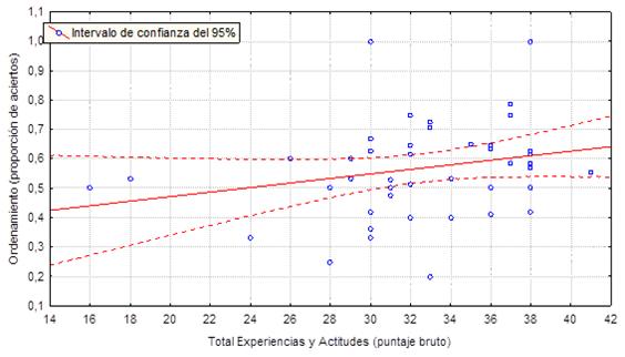 Se correlacionaron entre sí todas las variables de los dos instrumentos utilizados en la investigación. Se obtuvieron relaciones estadísticamente significativas (medias y positivas) entre la variable experiencias y actitudes hacia las matemáticas y la proporción de aciertos en la tarea No. 5 de ordenamiento numérico (r=0,34; t=2,37; p=0,02) (Gráfico 2).