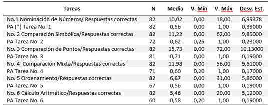 Se encontraron proporciones de aciertos más significativas en las tareas de: comparación de puntos (0,71) (DE=0,19), comparación simbólica (0,62) (DE=0,23) y comparación mixta (0,60) (DE=0,17).