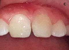 Año y medio después (18 meses) se apreció una evolución clínica favorable con ausencia de signos inflamatorios, VSG y PCR dentro de límites normales. En la a radiografía periapical se observó una adecuada cicatrización del tejido óseo. Se realizó reconstrucción con resina microhíbridas del tercio incisal de ambos incisivos centrales superiores (Figura 2) y se continuó con el seguimiento clínico.