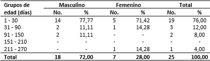 La tabla 1 muestra los pacientes según grupos de edad en días y sexo, donde se observó un predominio de pacientes del sexo masculino (72 %) con respecto al sexo femenino (28 %) y del grupo de edad de 1 a 30 días (76 %).
