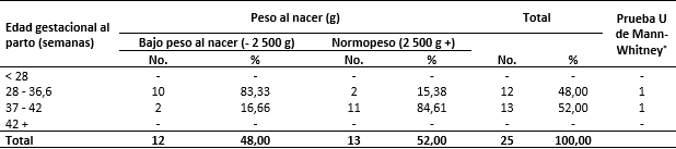 Al detallar la edad gestacional al parto y el peso al nacer (Tabla 2), se observó que no existió diferencia significativa entre los nacidos pretérmino y al término del embarazo, así como tampoco existió diferencia significativa entre los nacidos vivos con BPN y normopeso; además, la prueba U de Mann-Whitney no mostró valores significativos.