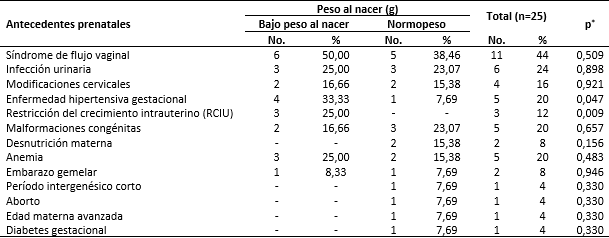 En cuanto a los pacientes según antecedentes prenatales y peso al nacer, se observó que el estadígrafo mostró relación estadísticamente significativa entre la enfermedad hipertensiva gestacional y la restricción del crecimiento intrauterino (RCIU) con respecto al BPN, siendo la restricción la que presentó relación más significativa, como se aprecia en la tabla 3.