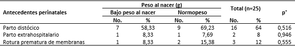 La tabla 4 muestra la distribución de pacientes según antecedentes perinatales y peso al nacer, donde se apreció que el estadígrafo no mostró relación estadísticamente significativa entre los elementos a comparar. Existió predominio del parto distócico en los nacidos con buen peso.