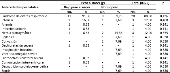 La distribución de pacientes según antecedentes posnatales y peso al nacer se refleja en la tabla 5, donde se puede observar que el estadígrafo no mostró relación estadísticamente significativa entre los elementos a comparar.