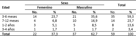 Al agrupar los pacientes estudiados según la edad, se aprecia que predominó el grupo de 3 a 6 meses con 35 casos (59,3 %), de ellos resultó más significativo el sexo masculino con el 35,6 % y en sentido general, también, fue el predominante con un 62,7 % del total. (Tabla 1)