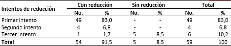 La tabla 2 muestra el comportamiento de la reductibilidad, obteniendo que de los 59 pacientes en estudio el 91,5 % resultó desinvaginado con el procedimiento. De ellos, en 49 se logró en el primer intento (83,0 %) y un 6,8 % en el segundo intento, solo se necesitó realizar un tercer intento para un 10,2 % de los casos estudiados, entre los cuales un 1,7 % se pudo reducir y solo en 5 pacientes fue necesaria la reducción por ordeñamiento manual mediante tratamiento quirúrgico.