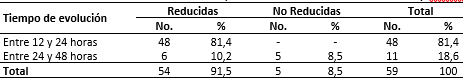 Lo anterior estuvo estrechamente relacionado con el tiempo de evolución de los síntomas y la reductibilidad (tabla 3). Se presentaron 48 invaginaciones con menos de 24 horas, de ellas se redujeron las 48, para el 81,4 %, y, 11, entre 24 y 48 h, después del inicio de los síntomas (18,6 %), de las que fueron reducidas 6 (10, 2 %).
