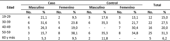 En relación a la edad (Tabla 1), predominaron los pacientes de 50-59 años con un 31,3 %. Tanto en el grupo de caso como el grupo control el sexo femenino fue más representativo con 52,2 % y 57,5 %, respectivamente.