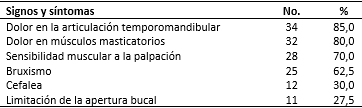 Results: Female patients were predominant (55%) and 51.25% were in the age range of 40-59 years. The most frequent signs and symptoms in patients with temporomandibular disorders were pain in the temporomandibular joints and in muscles of mastication for 85 % and 80 %, respectively. Most of the cases (52.5 %) presented high levels of anxiety.