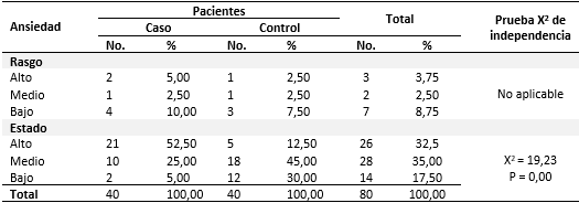 Se difiere de lo encontrado por Herrero Solano, et al.25 donde solo el 40,7 % de los pacientes presentaban un alto nivel de ansiedad como estado.