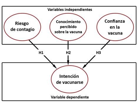 A pesar que los niveles de pacientes en Unidades de Cuidados Intensivos (UCI) han bajado considerablemente, los riesgos de contraer la enfermedad siguen latentes. Según Patelarou, et al.5 un riesgo de contagio hace referencia a las altas probabilidades que tiene una persona para contraer nuevamente el virus. A su vez, se ha visto que la necesidad de la sociedad para conocer cuál de las vacunas tiene mayor efectividad les ha conllevado a que busquen información para conocer los beneficios que adquieren al ponerse una vacuna. Luzuriaga, et al.8) expone que el conocimiento percibido sobre la efectividad de las vacunas permite a una persona aumentar su intención hacia la inoculación. Al mismo tiempo, estos autores determinaron que la confianza en las vacunas se da cuando las personas han percibido resultados positivos de la aplicación en otros países. Con base a lo anteriormente descrito, la intención de vacunarse se refiere a la voluntad propia que tiene una persona a desarrollar una acción que vaya en beneficio de promover defensas en su organismo y desarrollar inmunidad contra alguna enfermedad.1