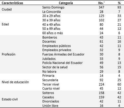 Un total de 389 observaciones fueron aplicadas a personas en estado de vulnerabilidad (bomberos, docentes, empleados públicos y privados, militares, policías, servidores de la salud y jubilados). Sin embargo, se descartaron 14 encuestas debido a que presentaron inconsistencias en su llenado; por lo que quedó un total de 375 para el análisis correspondiente. La información fue procesada a través de Excel y SPSS 21, y los datos se presentaron a través de tablas que describieron los hallazgos demográficos y los resultados propios de la investigación.