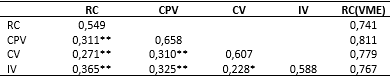 Con la finalidad de determinar la validez discriminante se comparó la raíz cuadrada de los valores del VME (RCVME) y las correlaciones entre cada par de las variables que formaron parte del estudio. Para determinar que existe validez discriminante es necesario que la raíz cuadrada de los resultados de la VME sea superior que los valores de las correlaciones entre cada par de variables.10 Ver tabla 3 a continuación.