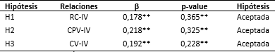 Los resultados del análisis del modelo proporcionaron un ajuste adecuado de los datos. χ2 (gl=527,893 (220); χ2/g=2,127; TLI=0,923; CFI=0,937; RMSEA=0,049, valores que cumplen con los parámetros de ajuste solicitados para la aprobación de un MES.10 La examinación de las relaciones entre las variables del estudio, permitió llegar a la aceptación de las tres hipótesis del estudio. A través de los estimados arrojados en el AMOS 24 Output, se demostró que el riesgo de contagio (β=0,178**), el conocimiento percibido sobre la vacuna (β=0,218**) y la confianza sobre la vacuna (β=0,192**) influyeron notablemente en la intención de recibir una cuarta dosis de inoculación por parte de los profesionales considerados como vulnerables a un nuevo contagio de COVID. La tabla 4 muestra los resultados de la aceptación y rechazo de hipótesis.