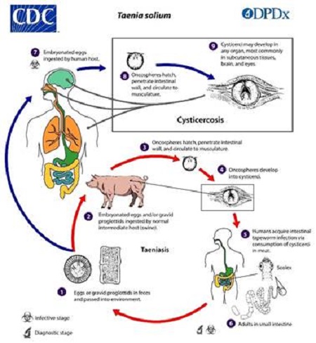Taenia solium tiene un ciclo de vida complejo que involucra un huésped intermedio habitual (cerdo), que alberga las larvas parasitarias en sus tejidos y un único huésped definitivo (humano) que alberga la tenia adulta en sus intestinos.(Figura 1)