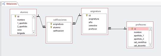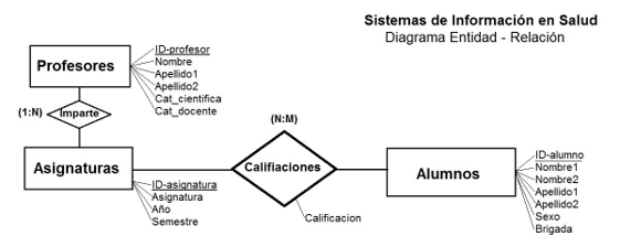 Se establecieron entre ellas las relaciones correspondientes según la descripción literal y, de esta manera, se estableció relación entre Alumnos y Asignaturas, y entre Asignaturas y Profesores. La correspondencia de cardinalidad entre las entidades Asignaturas y Profesores fue de tipo “de uno a varios (1:N)” y entre las entidades Alumnos y Asignaturas fue de “varios a varios (N:M)”. De cada una de las entidades y relaciones se determinaron los atributos, los cuales representan las características o propiedades que estas poseen.