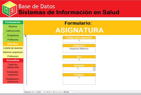 Introduction: The Facultad de Tecnología de la Salud has a database in use for gathering information concerning enrolled students; however, this database does not meet the needs of the department of Sistemas de Información en Salud, it is very important for professors to have a properly information management system helps them for performing the organizational strategies required.