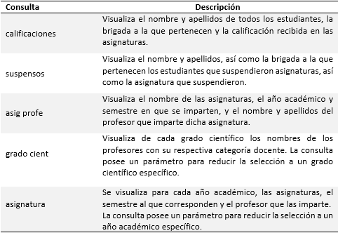 Fueron programadas cinco consultas que permitieron seleccionar los registros que cumplen unas determinadas condiciones para visualizarlos y poder operar con los registros. Se crearon las siguientes consultas de selección que se muestran en la Tabla 1.