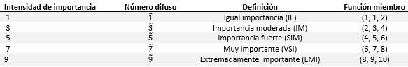 El Proceso Analítico Jerárquico Difuso (FAHP), teniendo en cuenta una escala de nueve puntos y cinco números difusos triangulares 1 , 3 , 5 , 7 , 9 , con las correspondientes funciones de pertenencia definidas en la tabla 1, se utilizan tanto para indicar la fuerza relativa de cada par de elementos de la misma jerarquía como para establecer la matriz difusa de decisión para la evaluación del rendimiento.