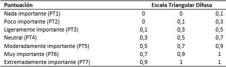 Se tuvo en cuenta los pasos de Parveen16) y posteriormente se aplicó el enfoque FTOPSIS sobre los datos obtenidos. Para asignar las puntuaciones en la escala difusa en relación con las evaluaciones realizadas por los encuestados, se asignó una función triangular, en la que cada puntuación está representada por tres números. La tabla 2 y tabla 3 ilustran las puntuaciones asignadas en este caso.