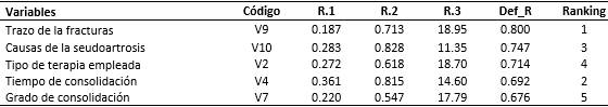 Por esta razón, los resultados fueron satisfactorios, es decir, el objetivo principal del presente estudio se cumplió, en proponer variables para robustecer el tratamiento propuesto con la evaluación del método FTOPSIS; se tuvo en cuenta las variables trazo de las fracturas, tiempo de consolidación, causas de la seudoartrosis, tipo de terapia empleada y grado de consolidación.