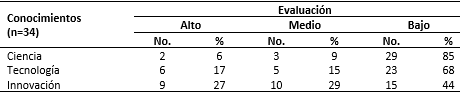 Se observó predominio del nivel Bajo del conocimiento sobre la definición de Ciencia (29), Tecnología (23) e Innovación (15), que representaron el 85 %, 69 % y 44 %, respectivamente (Tabla 1).
