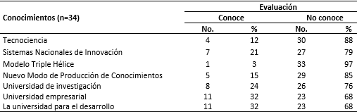 Hubo, igualmente, bajo nivel de conocimientos sobre los modelos que designan las relaciones CTS, donde la universidad ocupa un lugar relevante (Tabla 2).
