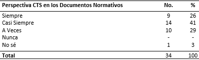 Se observó que el 41 % de los encuestados (14) refirieron que Casi Siempre aparece la perspectiva CTS en los documentos normativos de su actividad de dirección (Tabla 3).