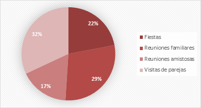 El gráfico 1 permite evidenciar que el mayor porcentaje de la población adolescente tuvo visitas de su pareja sentimental durante la pandemia (32 %), lo que contribuyó como uno de los factores de riesgo. Le siguieron en orden de frecuencia las reuniones familiares (29 %), las fiestas (22 %) y las reuniones amistosas (17 %).