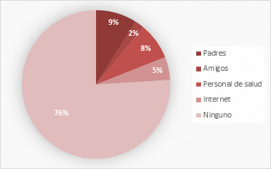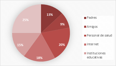 La mayoría señaló que la responsabilidad sobre la orientación en educación sexual viene por parte de los padres (63 %), pero hay que considerar que las instituciones de salud son importantes frente al caso porque se basan en promover, educar y prevenir problemas de salud. El 16 % refirió a las instituciones de salud, el 14 % a las instituciones educativas y hasta se halló un 7 % que refirió que era responsabilidad de amigos que conocen del tema.