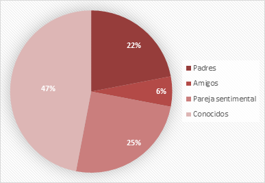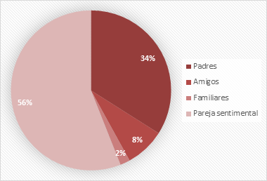 Durante el embarazo el 56 % de las adolescentes refirió haber recibido apoyo económico por parte de la pareja sentimental, sin embargo, es pertinente indicar que no solo se requiere de asunto económico, el apoyo debe ser integral. Los padres ayudaron al 34 % y familiares (2 %) y amigos (8 %) también lo hicieron (Gráfico 5).