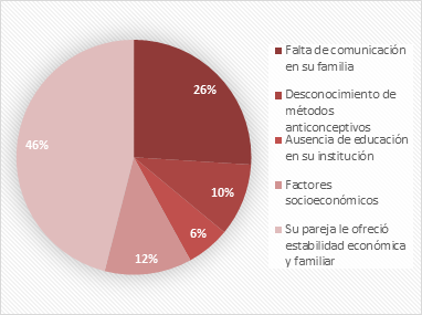 El mayor porcentaje de embarazos se debió a que su pareja sentimental le ofreció estabilidad económica y familiar (Gráfico 8), sin embargo, esto no garantizó una relación estable con su pareja; así se contrasta con un trabajo similar de Flores Cutipa16, el cual refiere que la gran mayoría de adolescentes embarazadas son convivientes y cuentan con el apoyo económico de sus parejas. Mientras que el 26 % lo atribuyó a falta de comunicación con sus padres y un menor por ciento (6 %) lo consideró debido a la ausencia de educación en su institución.