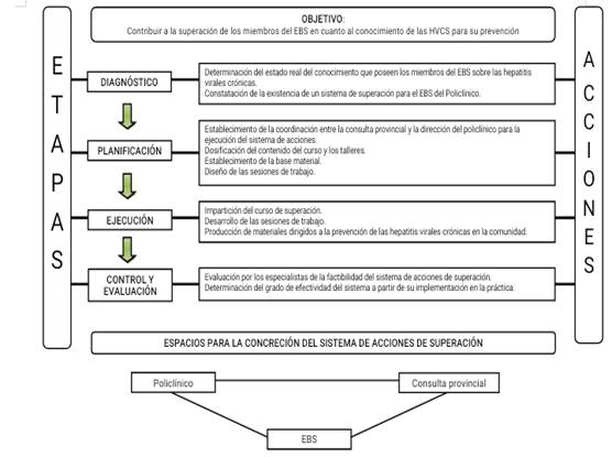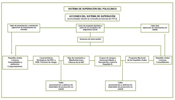 El sistema de superación contiene un programa de posgrado confeccionado de acuerdo con los indicadores metodológicos establecidos por la Dirección de Ciencias de la Universidad de Ciencias Médicas de Camagüey. Su objetivo estuvo dirigido a contribuir a la superación de los miembros de EBS en cuanto al conocimiento de las HVC para su prevención.