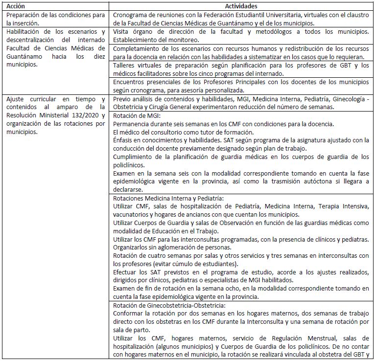 Aún la implementación de las adecuaciones nacionales para la culminación y comienzo de los cursos 2020-2021 y 2021-2022, fue modificada al aprovechar su flexibilidad, en función de mantener la calidad en la formación.8De ahí, la necesidad de la investigación-acción realizada, cuyo informe final fue la génesis del sistema de acciones aplicado al 6to. año de la carrera de Medicina, concebido desde la necesidad de priorizar la descentralización antes que la concentración por los motivos implícitos.