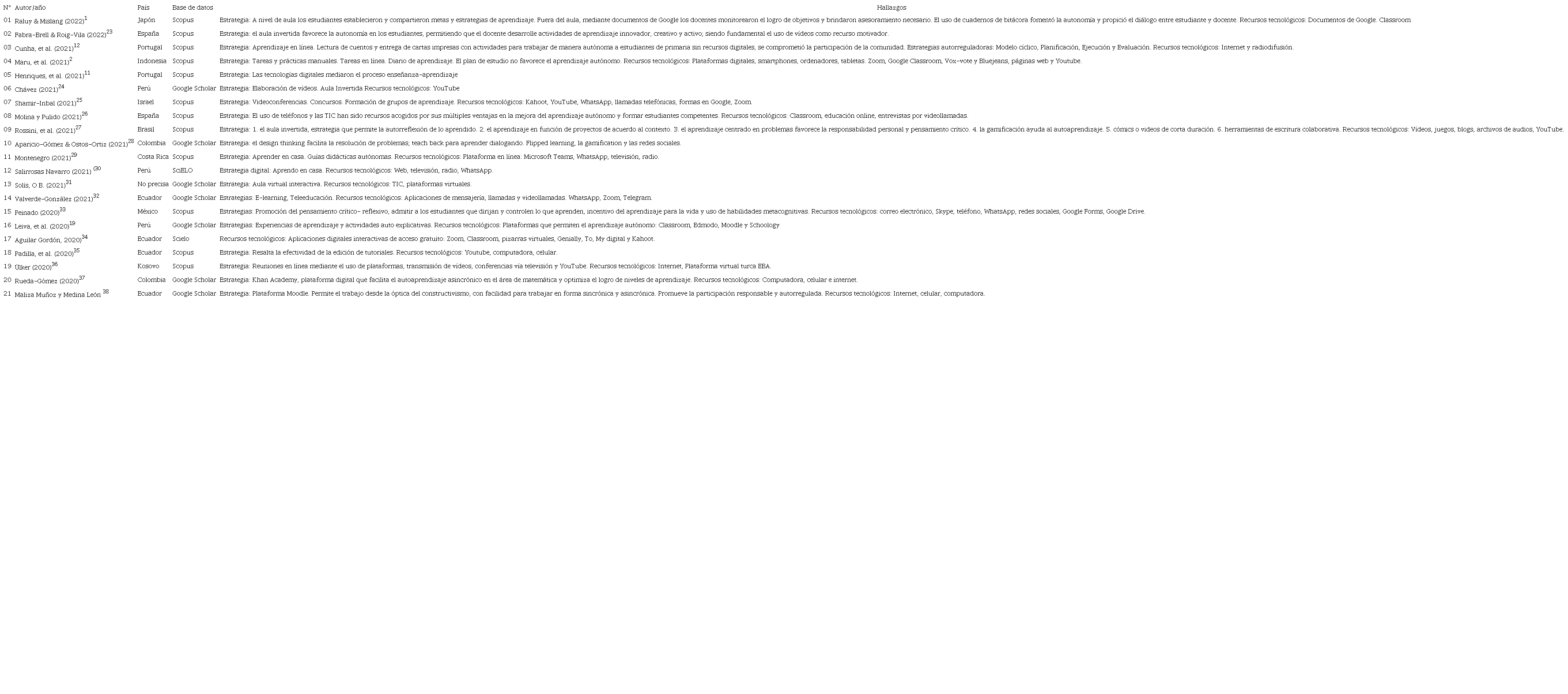 Se obtuvo una recopilación de producciones académicas referentes al aprendizaje autónomo, la información se precisa en función de estrategias metodológicas utilizados en la educación remota en estudiantes de educación básica y con aspiraciones a realizar estudios en salud. (Tabla 2).