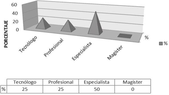 El personal que se desempeña en el área financiera tiene un nivel de educación avanzado; es idóneo, pero como lo muestra la gráfica, está desmotivado con poca percepción positiva del ambiente de trabajo; no obstante, este análisis se trasladará al área del Talento Humano para ser evaluada como clima organizacional (Figura 25).