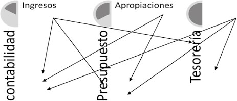 Elaboración propia, 2017La figura muestra un documento registrado en contabilidad, presupuesto y tesorería, con impacto en los tres procesos aumentando los ingresos presupuestales, afectando en el crédito la causación contable y registrando en caja y/o bancos el ingreso real.
