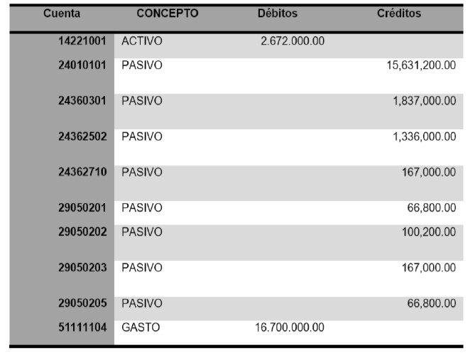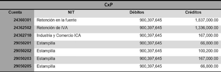 En contabilidad, se causa el valor de $3.740.800 que corresponden a retenciones que por Ley se deben de aplicar a los proveedores, como retención en la fuente, industria y comercio y las estampillas, moviendo cuentas del pasivo en el crédito y del activo en el débito como son el gasto y el IVA que es por cobrar. Al mover cada una de estas cuentas se debe tener en cuenta la mecánica de las mismas según el PUC de la Contaduría General de la Nación. Finalmente se genera una cuenta en el pasivo que es realmente lo que se cancelará, o por el cual se hará contablemente el cheque al proveedor $15.631.200 (Ver paso 2).