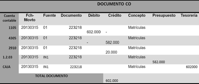Elaboración propia, 2017El ingreso registrado contablemente en el activo y el pasivo, constituye un ingreso para la Institución Universitaria y un recaudo para terceros respectivamente. En el registro presupuestal solo ingresa lo que está contablemente en el activo, porque el pasivo constituye un valor no presupuestal y en la tesorería se registra el ingreso total generando una cuenta por pagar a terceros.