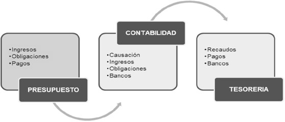 Elaboración propia, 2017.La propuesta quedará según la Figura 35 parametrizada y al finalizar una vigencia fiscal los resultados deben ser iguales en los tres elementos que componen el proceso financiero (ejecución presupuestal, balance general y movimiento de caja).