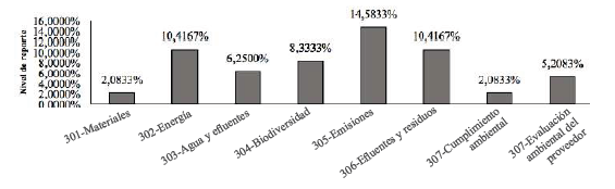 Elaboración propia con base en GRI Database.Respecto al resto de países, entre los cuales se encuentran Colombia y Ecuador, se identifica que los indicadores con mayor nivel de adopción (mayores a 10%) son 305-Emisiones, el cual arroja un 14,5833%; luego 302-Energía y 306-Efluentes y residuos comparten el mismo resultado 10,4167%; finalmente. se muestra un bajo 2,0833% de los indicadores 301- Materiales y 307-Cumplimiento ambiental.
