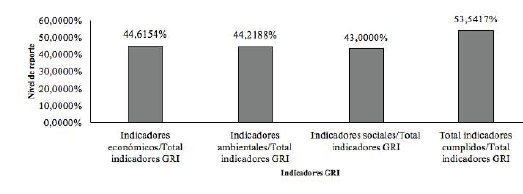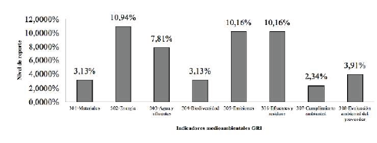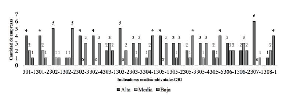 Al efectuar el recuento general, se identificó que, en promedio, las empresas químicas latinoamericanas seleccionadas cumplen en un 44,0956% los indicadores medioambientales del total propuesto por el GRI, superado por los indicadores económicos en una cantidad bastante baja y superando los indicadores sociales en una ínfima cantidad. En este punto, particularmente se observa que estas reportan información específicamente de los indicadores medioambientales, cuya temática compromete en gran medida a su industria. Tal es el caso de los indicadores 302-Energía, gracias a que actualmente hay una alta preocupación internacional frente al tema de la gestión energética por su alto nivel de contaminación (Berenguer et al., 2019); 305-Emisiones, puesto que los efectos nocivos producidos por la industria química en la actualidad son bastante elevados, y generan alteraciones en la salud humana y en los ecosistemas del mundo (De la Cruz-Monte et al., 2011). También se observa que 303-Agua y efluentes y 306-Efluentes y residuos tienen un alto nivel de revelación; de acuerdo con Becerra y Espinoza (2002), la degradación química y un inadecuado manejo de residuos industriales provocan una pérdida irreparable de los suelos y el agua, respectivamente.