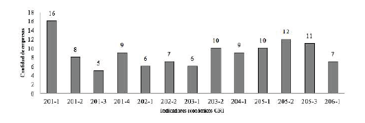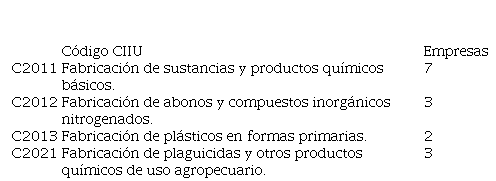 Las empresas químicas que cumplieron con las dos características anteriores fueron 51, y su actividad principal fue catalogada en la división 20 y 21 del CIIU.