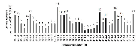 Elaboración propia con base al GRI Database.En consecuencia, los indicadores sociales que mayor incidencia en la revelación tuvieron son los mayores a diez, observados en la Figura 11. En este punto, es preciso afirmar que las empresas del sector químico del Área Metropolitana del Valle de Aburrá también estarán en la capacidad de informar acerca de la mayoría de los siguientes indicadores como mínimo: 404-1 media de horas de formación al año por empleado; 416-1 evaluación de los impactos en la salud y seguridad de las categorías de productos o servicios; 413-1 operaciones con participación de la comunidad local, evaluaciones del impacto y programas de desarrollo; 403-2 Identificación de peligros, evaluación de riesgos e investigación de incidentes; 405- 1 diversidad en órganos de gobierno y empleados; 419-1 incumplimiento de las leyes y normativas en los ámbitos social y económico; 401-1 nuevas contrataciones de empleados y rotación de personal; 404-2 programas para mejorar las aptitudes de los empleados y programas de ayuda a la transición; 404-3 porcentaje de empleados que reciben evaluaciones periódicas del desempeño y desarrollo profesional; 401-2 prestaciones para los empleados a tiempo completo que no se dan a los empleados a tiempo parcial o temporales; 417-1 requerimientos para la información y el etiquetado de productos y servicios; y 414-1 nuevos proveedores que han pasado filtros de selección de acuerdo con los criterios sociales.