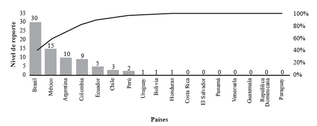 Para llevar a cabo dicho análisis fue necesario seleccionar una muestra de empresas latinoamericanas, tomadas de los cinco primeros países que mostraban el índice más alto de organizaciones químicas y de cuidado de la salud en la GRI Database. En la Figura 1 se observa el nivel de reporte de las empresas por países latinoamericanos; es por ello que las empresas seleccionadas fueron de los siguientes países: Argentina, Brasil, Colombia, Ecuador y México, los cuales sumaban un porcentaje acumulado de 89,61% a nivel de Pareto.