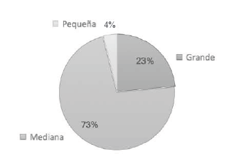 Posteriormente, se procedió a hacer una clasificación de estas de acuerdo con el total de activos brutos, basado en la Ley 905 de 2004; lo que arrojó como resultado el descrito en la Figura 3, en donde el 73% de empresas es de tamaño mediano (5001-30000 SMLMV), seguida de un 23% en empresas de gran tamaño (más de 30000 SMLMV) y finalmente tan solo el 4% del total son pequeñas empresas (501-5000 SMLMV).
